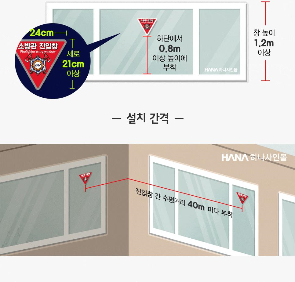 | <건축물의 피난ㆍ방화구조 등의 기준에 관한 규칙> 제18조의2(소방관 진입창의 기준) 법 제49조제3항에서 "국토교통부령으로 정하는 기준"이란 다음 각 호의 요건을 모두 충족하는 것을 말한다. 1. 2층 이상 11층 이하인 층에 각각 1개소 이상 설치할 것. 이 경우 소방관이 진입할 수 있는 창의 가운데에서 벽면 끝까지의 수평거리가 40미터 이상인 경우에는 40미터 이내마다 소방관이 진입할 수 있는 창을 추가로 설치해야 한다. 2. 소방차 진입로 또는 소방차 진입이 가능한 공터에 면할 것 3. 창문의 가운데에 지름 20센티미터 이상의 역삼각형을 야간에도 알아볼 수 있도록 빛 반사 등으로 붉은색으로 표시할 것 4. 창문의 한쪽 모서리에 타격지점을 지름 3센티미터 이상의 원형으로 표시할 것 5. 창문의 크기는 폭 90센티미터 이상, 높이 1.2미터 이상으로 하고, 실내 바닥면으로부터 창의 아랫부분까지의 높이는 80센티미터 이내로 할 것 6. 다음 각 목의 어느 하나에 해당하는 유리를 사용할 것 가. 플로트판유리로서 그 두께가 6밀리미터 이하인 것 나. 강화유리 또는 배강도유리로서 그 두께가 5밀리미터 이하인 것 다. 가목 또는 나목에 해당하는 유리로 구성된 이중 유리로서 그 두께가 24밀리미터 이하인 것 |