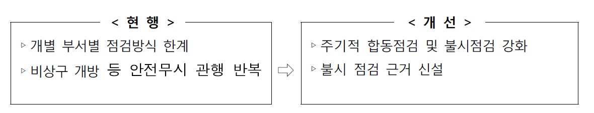 5. 신종업소의 면밀한 운영실태 점검을 위해 합동점검(위생․건축․소방․전기 등) 및 불시점검을 강화, 불시 점검을 위한 근거도마련할 예정(소방청, 행안부, 문체부, 식약처)