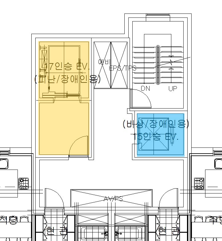 법 개정에 따라 피난용승강기(노랑색)을 추가로 설치하여야 합니다.