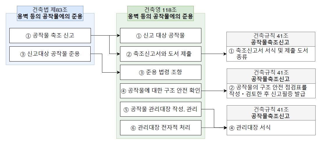 | 건축법제83조(옹벽 등의 공작물에의 준용) ① 대지를 조성하기 위한 옹벽, 굴뚝, 광고탑, 고가수조(高架水槽), 지하 대피호, 그 밖에 이와 유사한 것으로서 대통령령으로 정하는 공작물을 축조하려는 자는 대통령령으로 정하는 바에 따라 특별자치시장ㆍ특별자치도지사 또는 시장ㆍ군수ㆍ구청장에게 신고하여야 한다. <개정 2014. 1. 14.> 건축법 시행령제118조(옹벽 등의 공작물에의 준용) ① 법 제83조제1항에 따라 공작물을 축조(건축물과 분리하여 축조하는 것을 말한다. 이하 이 조에서 같다)할 때 특별자치시장ㆍ특별자치도지사 또는 시장ㆍ군수ㆍ구청장에게 신고를 하여야 하는 공작물은 다음 각 호와 같다. <개정 2014. 10. 14., 2016. 1. 19.> 1. 높이 6미터를 넘는 굴뚝 2. 삭제 <2020. 12. 15.> 3. 높이 4미터를 넘는 장식탑, 기념탑, 첨탑, 광고탑, 광고판, 그 밖에 이와 비슷한 것<2021.06.16 시행> 4. 높이 8미터를 넘는 고가수조나 그 밖에 이와 비슷한 것 5. 높이 2미터를 넘는 옹벽 또는 담장 6. 바닥면적 30제곱미터를 넘는 지하대피호 7. 높이 6미터를 넘는 골프연습장 등의 운동시설을 위한 철탑, 주거지역ㆍ상업지역에 설치하는 통신용 철탑, 그 밖에 이와 비슷한 것 8. 높이 8미터(위험을 방지하기 위한 난간의 높이는 제외한다) 이하의 기계식 주차장 및 철골 조립식 주차장(바닥면이 조립식이 아닌 것을 포함한다)으로서 외벽이 없는 것 9. 건축조례로 정하는 제조시설, 저장시설(시멘트사일로를 포함한다), 유희시설, 그 밖에 이와 비슷한 것 10. 건축물의 구조에 심대한 영향을 줄 수 있는 중량물로서 건축조례로 정하는 것 11. 높이 5미터를 넘는 「신에너지 및 재생에너지 개발ㆍ이용ㆍ보급 촉진법」 제2조제2호가목에 따른 태양에너지를 이용하는 발전설비와 그 밖에 이와 비슷한 것 |