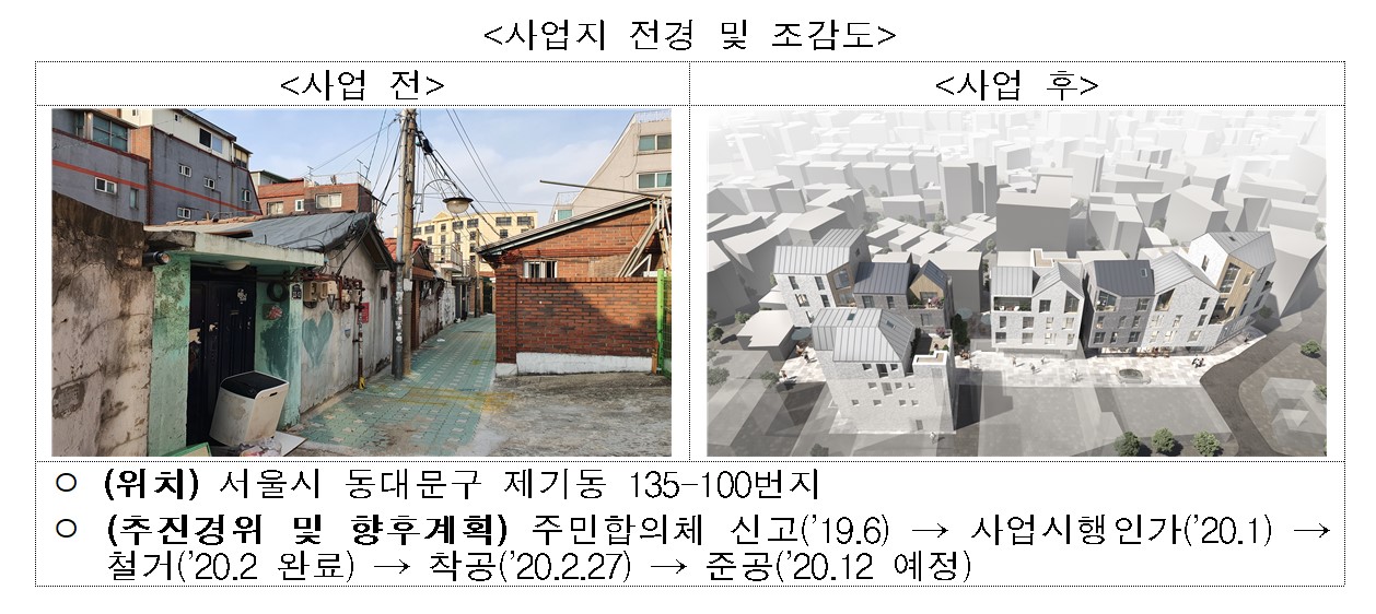 국토교통부는 ’ 19년도에 선정된 도시재생 뉴딜사업지* 내 노후 저층주거지에서 자율주택정비사업을 20년 2월 27일 착공한다고 밝혔습니다.
