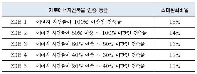 ※ 건축물 에너지효율등급 인증 1++등급을 획득하고, 에너지 자립률이 20%미만인 경우 최대 완화비율은 10%