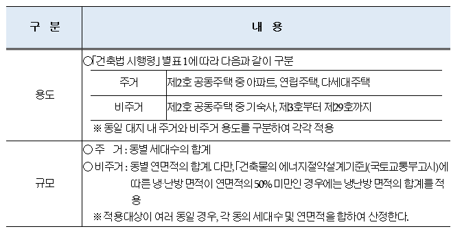 나. 적용대상의 구분: 용도와 규모에 따라 다음과 같이 구분