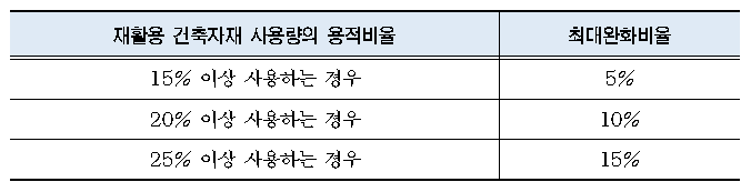- 건축물의 신축 시 골조공사에 재활용 건축자재 사용에 따른 완화비율