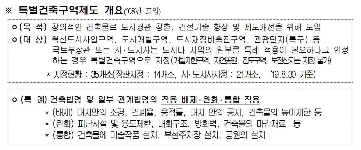 ㅇ특별건축구역* 제도를 활성화하기 위해 민간도 창의적 건축물을 계획하는 경우 용적률, 높이 등의 특례가 부여되는 특별건축구역의 지정을 시‧도지사에게 제안할 수 있도록 하였다.