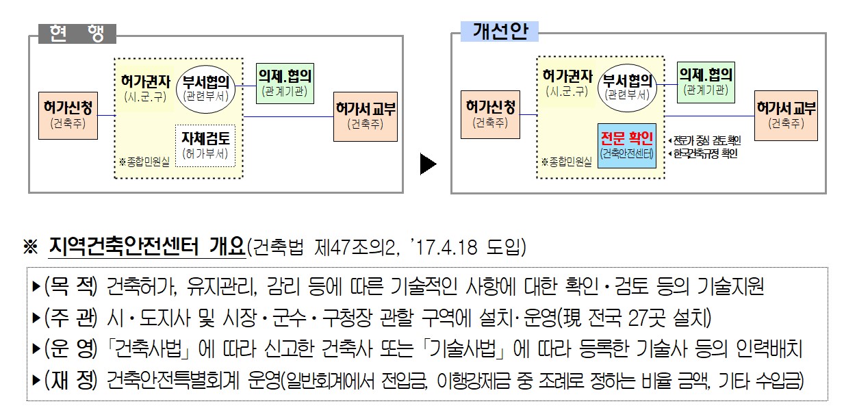 - 건축사‧기술사 등 전문가로 구성된 지역건축안전센터*의 업무기능을 허가‧신고에 관한 업무까지 확대
