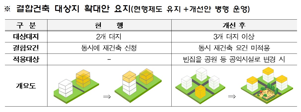ㅇ현재 인접대지 간 용적률을 이전할 수 있는 결합건축*은 2개 대지간 결합만 인정하고 있으나, 도시재생사업 등의 활성화를 위해 공공건축물과 결합하거나 빈집을 공원 등 공익시설로 변경하는 경우에는 3개 이상의 대지를 결합할 수 있도록 하였다.