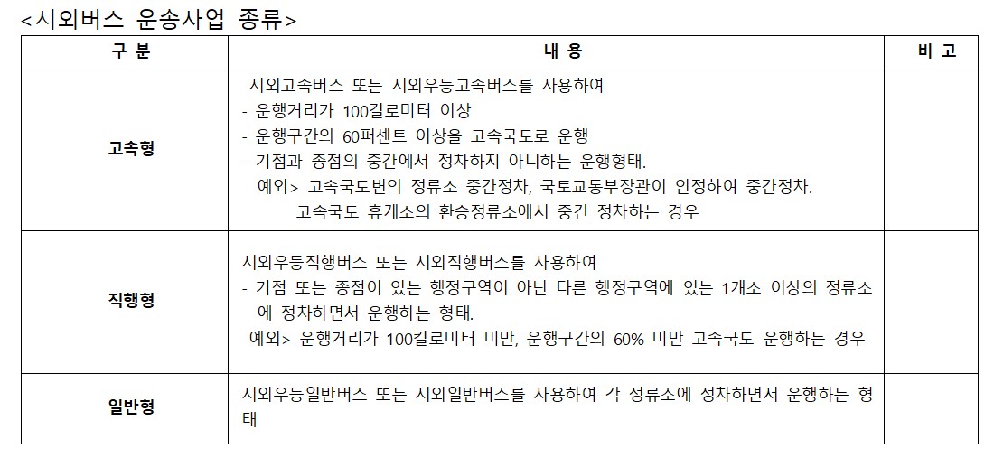 고속형을 고속버스, 직행형과 일반형을 시외버스로 구분합니다.