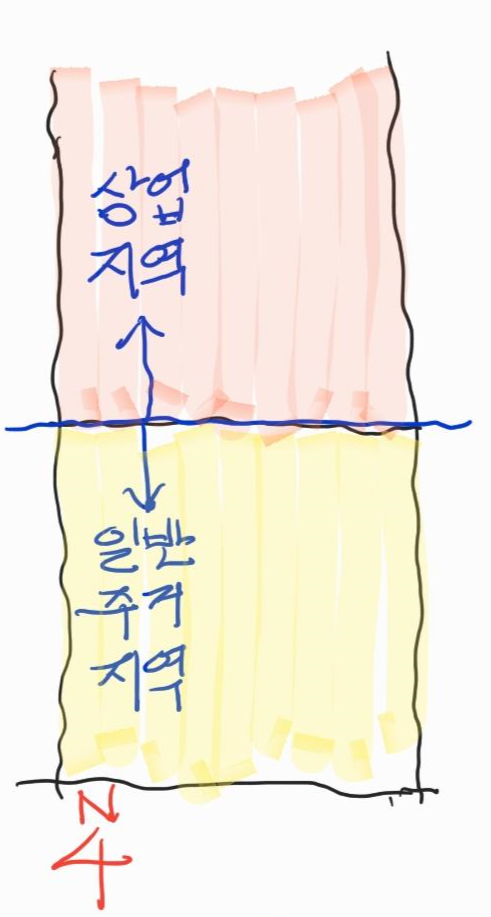 이런 경우 노란색 대지는 북측이 상업지역이기