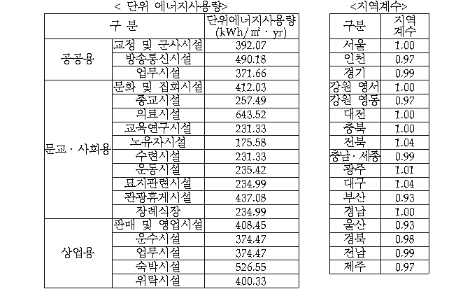 용도별 건축물의 단위면적당 연간 사용이 예측되는 에너지의 양
