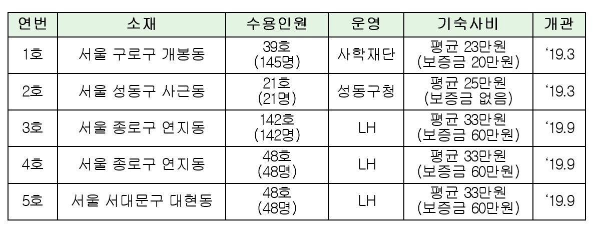 - 입주대상은 평균소득 100% 이하인 대학생, 대학원생, 19~39세 청년