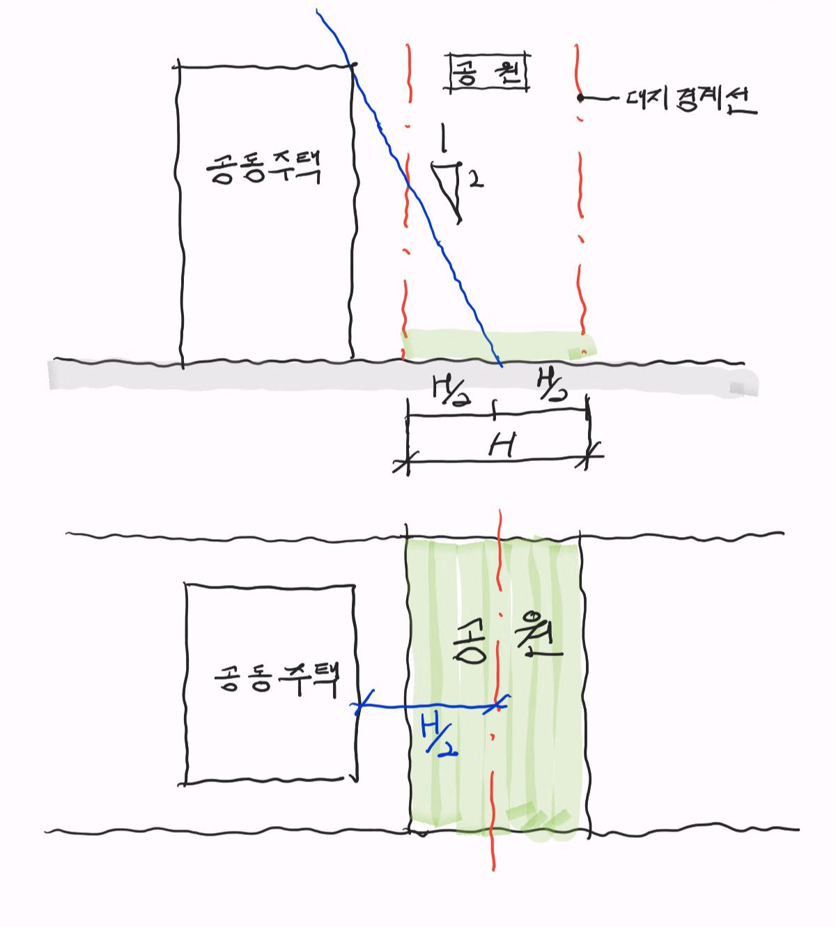 | 건축법 시행령 제86조(일조 등의 확보를 위한 건축물의 높이 제한) ⑦ 제1항부터 제5항까지의 규정을 적용할 때 건축물(공동주택으로 한정한다)을 건축하려는 하나의 대지 사이에 제6항 각 호의 시설 또는 부지가 있는 경우에는 지방건축위원회의 심의를 거쳐 제6항 각 호의 시설 또는 부지를 기준으로 마주하고 있는 해당 대지의 경계선의 중심선을 인접 대지경계선으로 할 수 있다. <신설 2018. 9. 4.> |