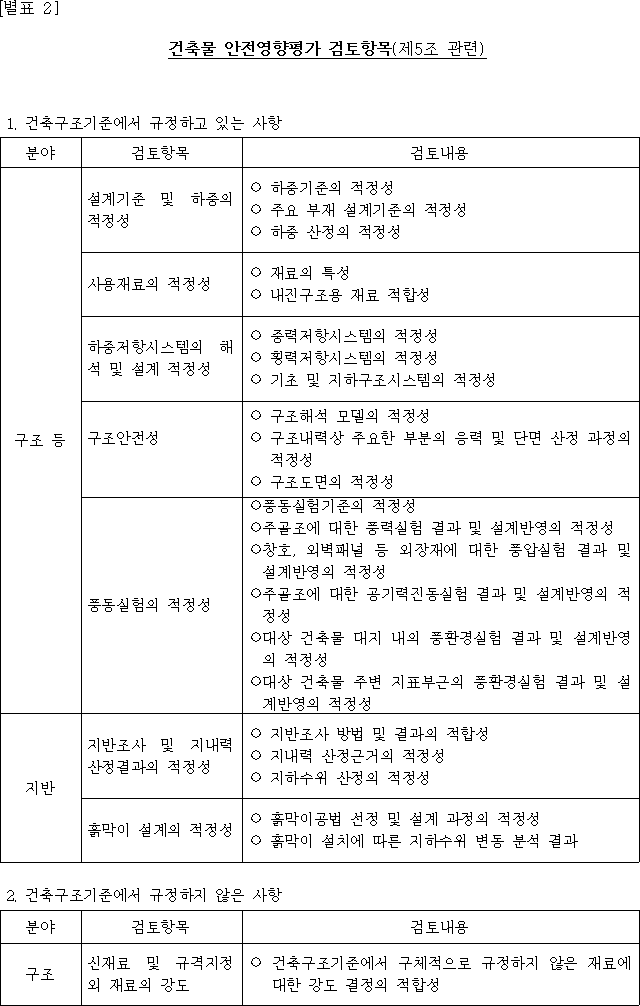 1. 해당 건축물에 적용된 설계 기준 및 하중의 적정성 2. 해당 건축물의 하중저항시스템의 해석 및 설계의 적정성 3. 지반조사 방법 및 지내력(地耐力) 산정결과의 적정성 4. 굴착공사에 따른 지하수위 변화 및 지반 안전성에 관한 사항 5. 그 밖에 건축물의 안전영향평가를 위하여 국토교통부장관이 필요하다고 인정하는 사항 |
