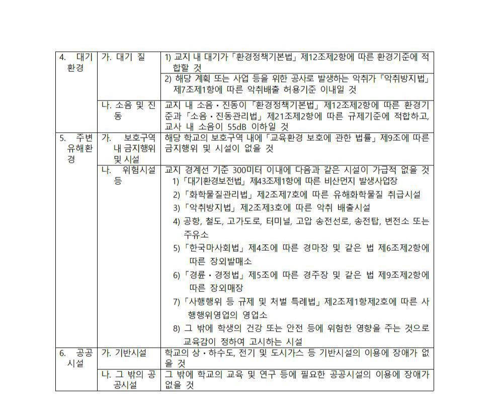 교육환경 보호에 관한 법률 1. 학교를 설립하려는 자 2. 「국토의 계획 및 이용에 관한 법률」 제24조에 따른 도시ㆍ군관리계획의 입안자 3. 「학교용지 확보 등에 관한 특례법」 제3조제1항에 따른 개발사업시행자 4. 학교(「고등교육법」 제2조 각 호에 따른 학교는 제외한다) 또는 제8조제1항에 따라 설정ㆍ고시된 교육환경보호구역이 「도시 및 주거환경정비법」 제2조제1호에 따른 정비구역으로 지정ㆍ고시되어 해당 구역에서 정비사업을 시행하려는 자 5. 제8조제1항에 따라 설정ㆍ고시된 교육환경보호구역에서 「건축법」 제11조제1항 단서에 따른 규모의 건축을 하려는 자 |