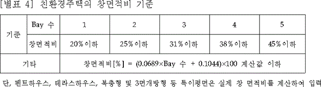 | 에너지절약형 친환경주택의 건설기준 제2조(정의) 이 고시에서 사용하는 용어의 뜻은 다음과 같다. 17. "창면적비"란 세대 내 전용부위에 설치되는 창의 면적을 천장과 바닥 면적을 제외한 전용부위의 모든 벽과 창호의 면적을 합한 값으로 나눈 값을 말한다. 제7조(설계조건) ① 친환경주택은 다음 각 호 중에서 어느 하나의 설계조건을 충족하여야 한다. ~ 생략 ~ 마. 창면적비 : 세대내의 창면적비는 별표 4를 만족하도록 설계할 것 |