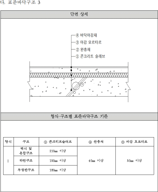 - 표준바닥구조: 중량충격음 및 경량충격음을 차단하기 위해 콘크리트 슬라브, 완충재, 마감 모르타르, 바닥마감재 등으로 구성된 일체형 바닥구조