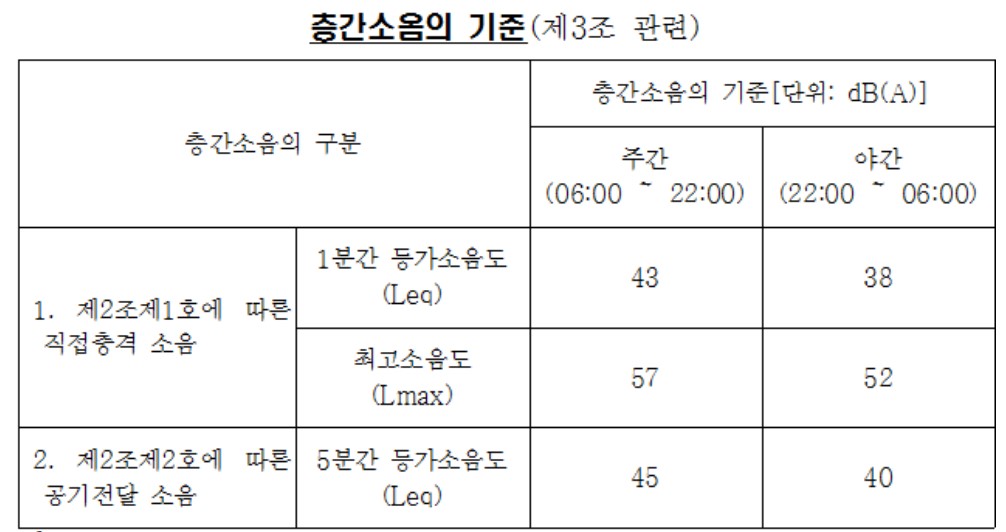 그리고 소음방지를 위한 바닥의 세부 기준은 국토교통부장관이 따로 정하여 아래와 같은 내용으로 고시합니다.
