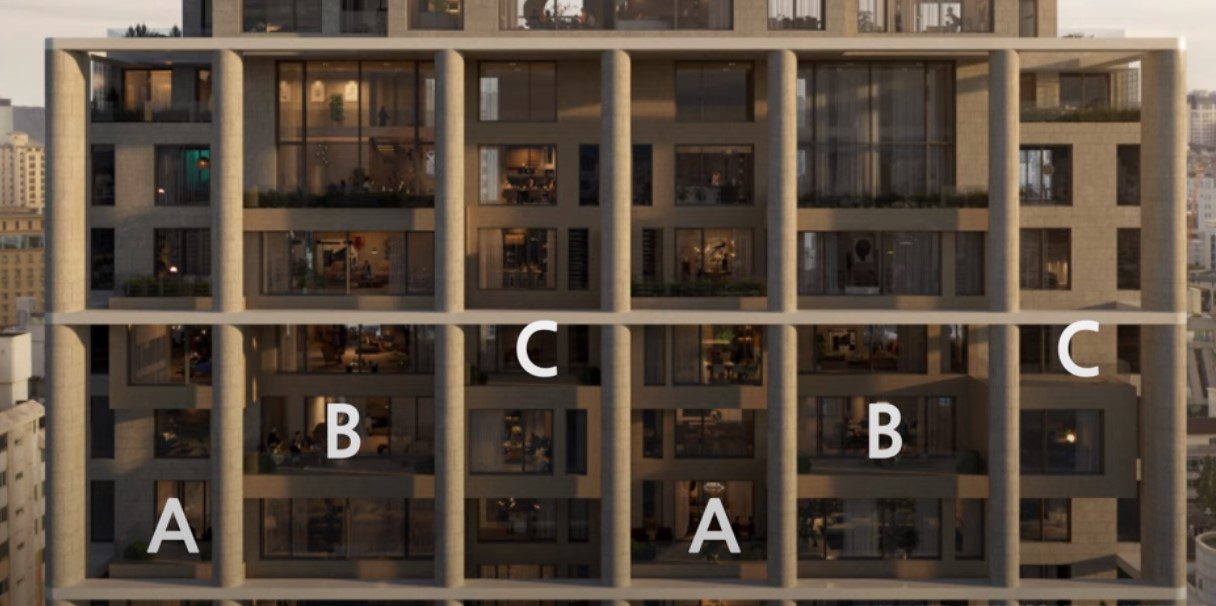 전세대 제공 테라스가 지그재그 형태로 배치되며