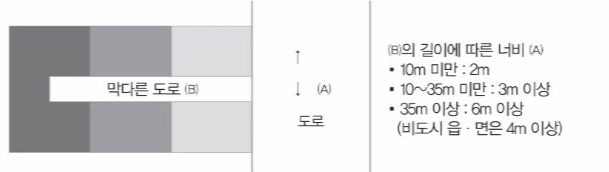 | 건축법 시행령제3조의3(지형적 조건 등에 따른 도로의 구조와 너비) 법 제2조제1항제11호 각 목 외의 부분에서 “대통령령으로 정하는 구조와 너비의 도로”란 다음 각 호의 어느 하나에 해당하는 도로를 말한다.<개정 2014. 10. 14.> 1. 특별자치시장ㆍ특별자치도지사 또는 시장ㆍ군수ㆍ구청장이 지형적 조건으로 인하여 차량 통행을 위한 도로의 설치가 곤란하다고 인정하여 그 위치를 지정ㆍ공고하는 구간의 너비 3미터 이상(길이가 10미터 미만인 막다른 도로인 경우에는 너비 2미터 이상)인 도로 2. 제1호에 해당하지 아니하는 막다른 도로로서 그 도로의 너비가 그 길이에 따라 각각 다음 표에 정하는 기준 이상인 도로 |