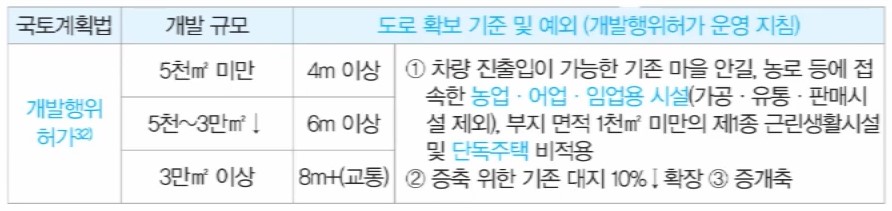 1) 진입도로의 폭은 개발규모(개설 또는 확장하는 도로면적 제외)
