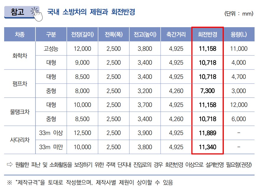 최소 회전반경 10m이상이 되도록 설계 반영 권고.