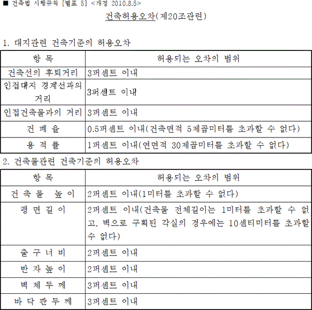 | 건축법 시행규칙 제20조(허용오차) 법 제26조에 따른 허용오차의 범위는 별표 5와 같다. |