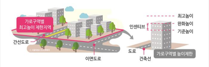 #가로구역_높이지정 허가권자는 가로구역(각주: 도로로 둘러싸인 일단(一團)의 지역)을 건축물의 높이를 지정ㆍ공고할 수 있다고 규정하고 있습니다. 또한 허가권자는 가로구역의 높이를 완화