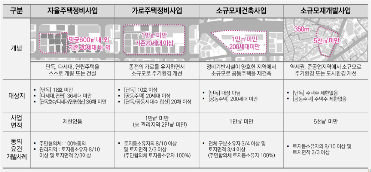 소규모주택 정비사업 소규모주택 정비를 활성화하기 위하여 필요한 사항 및 특례를 규정하기 위해 이 만들어졌습니다. 소규모주택 정비사업은 아래와 같이 3가지 종류로 구성됩니다. 가. 자율